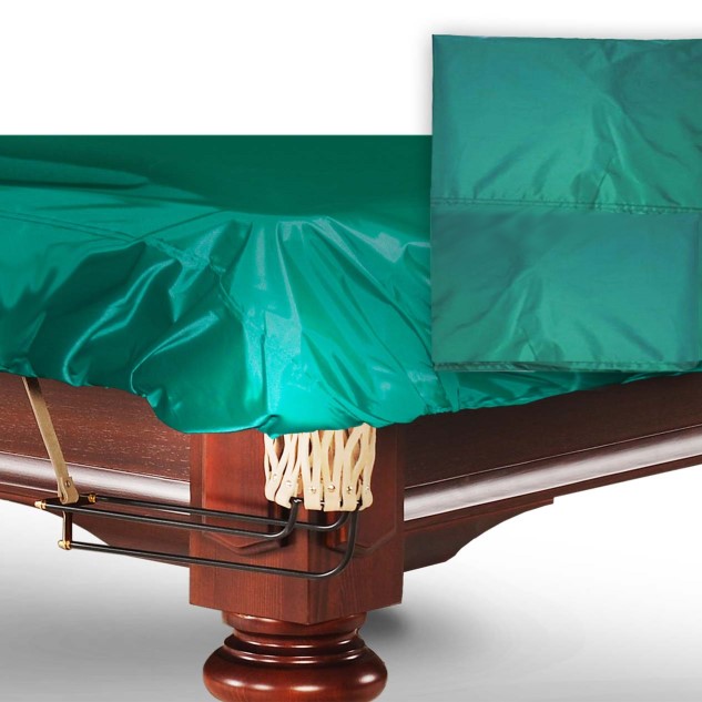 Если бильярдный стол не используется, то между играми его нужно защищать при помощи покрывала. Благодаря покрывалу бильярдный стол будет защищен от воздействия пыли и загрязнений, например от пролитых напитков. Данный чехол предназначен для бильярдного стола размером восемь футов, а изготовлен из ПВХ с влагостойкой пропиткой. Данный материал идеален для защиты бильярдного стола, так как он не пропустит сквозь себя влагу и пыль, его очень легко очищать, для очищения просто стоит протереть его влажной тряпочкой. Покрывало зелёное, этот цвет прекрасно подойдёт к бильярдному помещению.