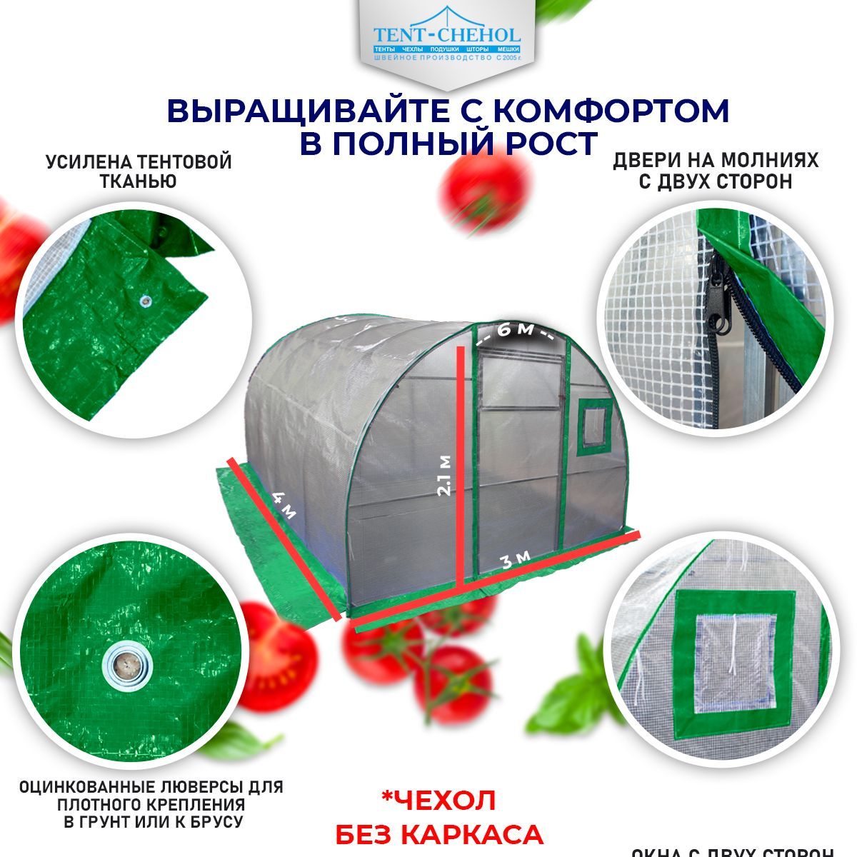 Чехол на теплицу длиной 6 метров, шириной 3 метра. Высота - 2,1 м. Предназначен для покрытия арочных (полукруглых теплиц).Чехол продается для готового каркаса, в комплекте каркаса нет.